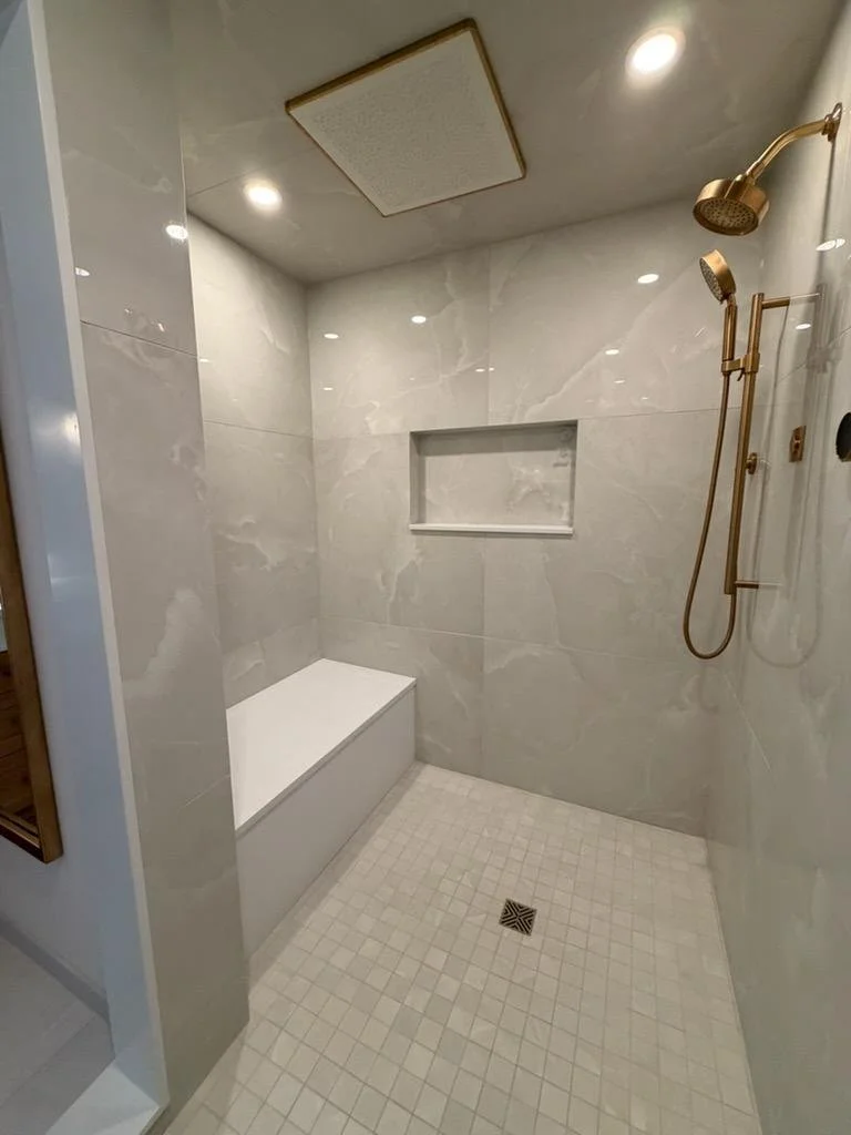 3’x3’ tiles in a steam shower. Ceiling and wall grout joints all flow perfectly together.